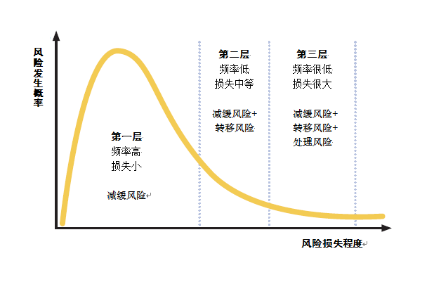 3、风险管理策略:根据风险发生概率和损失程度的不同,世行将农业风险分为三个层次,并施以相应的风险管理策略。其中,第一层次风险频率高且损失小,这种情况适合采取降低负面影响或者损失程度的减缓策略,主要方式包括提高灌溉能力、良种推广、完善预警系统和提高田间技术等;第二层次风险频率低而损失中等,这种情况不仅适合采取减缓策略,而且通常还会利用商业保险和风险对冲等手段将风险转移以减轻损失;第三层次风险频率很低但损失巨大,这时不仅要采取风险减缓和转移策略,还要通过社会安全网、缓冲基金、储蓄、战略储备等手段及时应对风险发生后造成的巨大损失,使风险管理主体能够正常运转。(如图2)