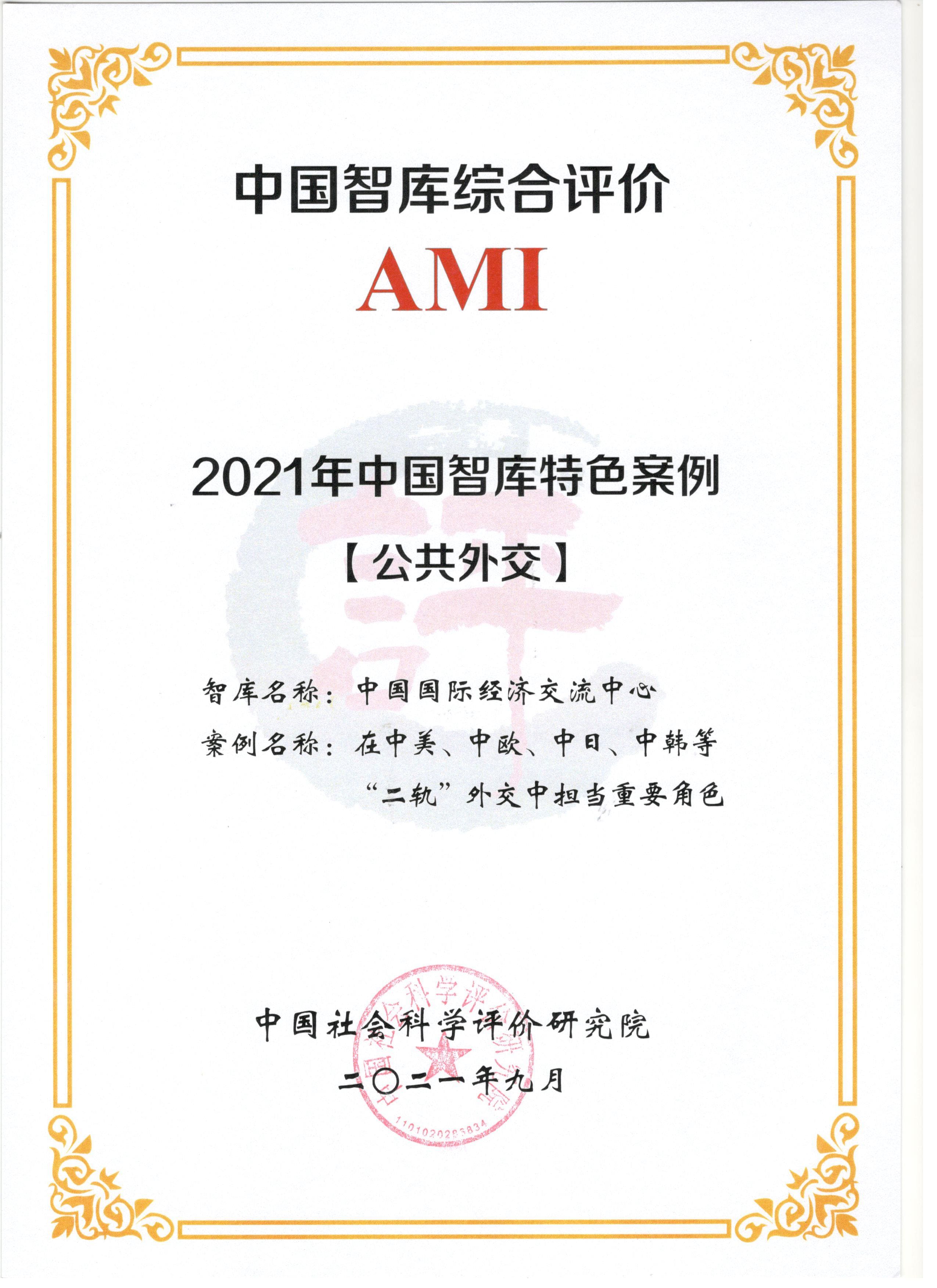 2021年9月28日,由中国社会科学评价研究院主办的“第四届中国智库建设与评价高峰论坛暨《中国智库综合评价AMI研究报告(2021)》发布会”在京举行。此次智库综合评价研究项目,以“中国智库综合评价AMI指标体系(2021年版)”和《人文社会科学智库评价指标体系(GB/T 40106-2021)》为标准,聚焦“资政建言”“理论创新”“舆论引导”“社会服务”“公共外交”和“内部治理创新”六项特色指标,对智库特色案例进行评选。经过多轮专家评审,从454家智库反馈的621份申报书中,遴选出56项特色案例。中心在“资政建言”和“公共外交”方面同时入选2项特色案例,充分体现了中心在服务国家重大外交和战略决策中发挥的重要作用。