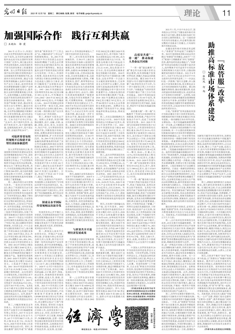2001年12月11日,我国正式成为世界贸易组织(WTO)第143个成员,这不仅标志着世贸组织由此成为发达国家和发展中国家广泛参与、真正意义的世界多边贸易组织,也是我国改革开放与经济发展史上的重要里程碑。加入世界贸易组织使我国开始对标国际经贸规则进行全面体制改革和制度型开放,加速向市场经济转型,通过与国际规则接轨融入全球市场体系和产业分工体系,成功将我国的资源要素禀赋与国际产业转移的重要机遇紧密结合,提升组合全球资源要素的能力和水平,全面深度融入全球价值链,促进开放型经济快速发展和开放型经济新体制形成。同时,我国严格履行承诺,推动贸易投资自由化便利化,建设市场化、法治化、国际化的营商环境,为世界各国提供超大规模市场、分享发展机遇,成为经济全球化的重要贡献者和有力推动者。习近平总书记指出,“这20年,是中国深化改革、全面开放的20年,是中国把握机遇、迎接挑战的20年,是中国主动担责、造福世界的20年”。